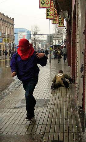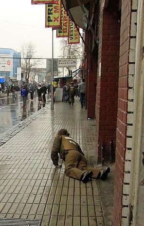 Altro fatto simile è avvenuto nella calle 18 in pieno centro di Santiago, quando un camion della gendarmeria ha perso il controllo e si è schiantato contro un palo. Al che il copilota è fuggito rapidamente, mentre l’autista ha ricevuto un paio di sprangate e pietrate prima di riuscire a scappare. Il camion, che si trovava solo in mezzo alla strada, è stato attaccato da una grande quantita di incappicciati/e che mentre lo rovinavano e cercavano di incendiarlo, cercavano anche di aprirlo. Pare che sia poi arrivato l’idrante dei carabineros a soccorrerlo e tutti hanno potuto notare che nel camion si trovavano 2 carcerieri nascosti.